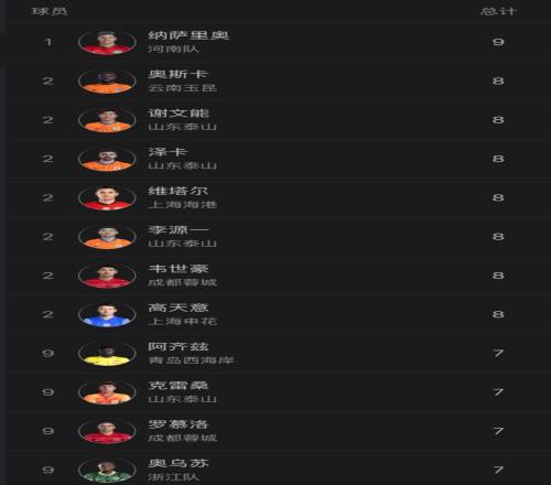 在奧斯卡離開后,中超助攻榜呈現群雄亂戰。納薩里奧9次助攻領跑。身后有7人8次助攻,4人7次助攻,因此末輪比賽誰能獲得助攻王殊榮,懸念巨大。