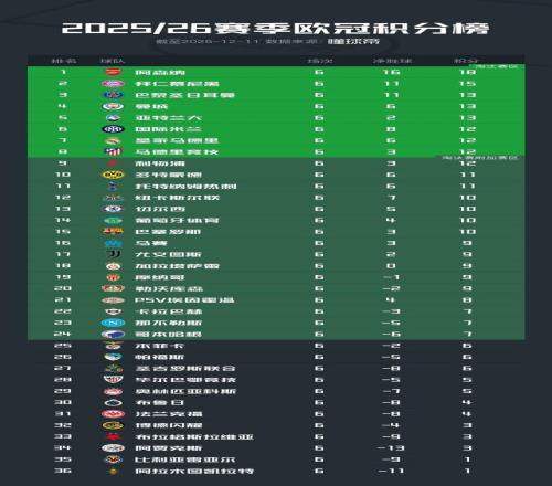 北京時間12月11日,2025/26賽季歐冠聯賽階段結束了第6輪的全部較量,積分榜的形勢也產生了進一步的變化。