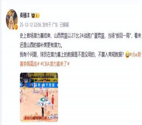 麥穗豐:“史上首場潛力賽結(jié)束,山西男籃以27比24戰(zhàn)勝廣廈男籃,當場“扳回一局”,看來還是山西的替補席更有潛力。我有個問題,球員在潛力賽上的數(shù)據(jù)是不是沒用的,不算入常規(guī)數(shù)據(jù)?。”