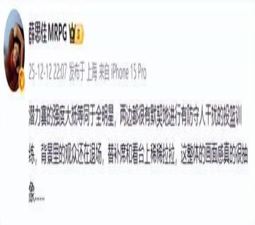 薛思佳:“潛力賽的強度大抵等同于全明星,兩邊都很有默契地進行有防守人干擾的投籃訓練,背景里的觀眾還在退場,替補席和看臺上稀稀拉拉,這整體的畫面感真的很抽象……”